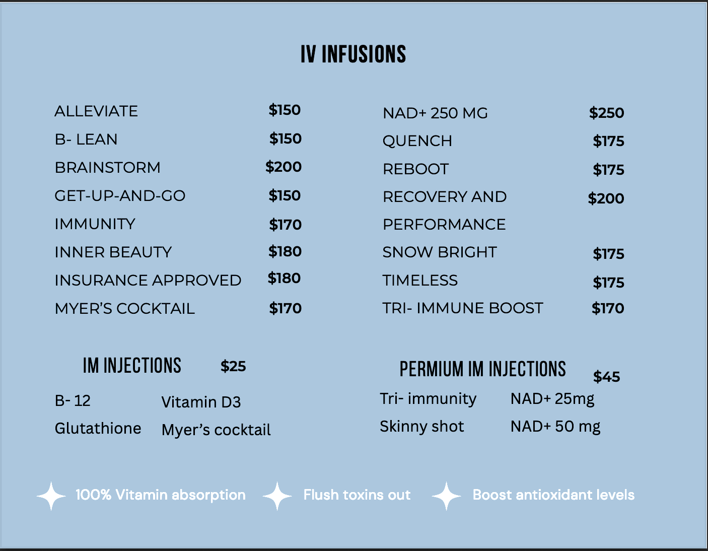 Medical procedure to provide nutrients, vitamins, hydration, pain management medications and antioxidant solutions intravenously (IV) via an IV Drip or directly into the muscle via an Intramuscular (IM) injection.